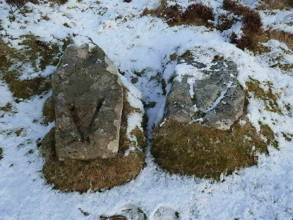 The famous Dartmoor V-stones (as described in Dartmoor News, No. 93, Nov-Dec 2006) at SX 67543 81383 � 4m. Several ideas as to their function have been suggested, from being anchor points for rope-spinning to pointing the way to the Warren House Inn. The link includes a suggestion that they may have been for mounting trucks onto the rails of a light tramway.