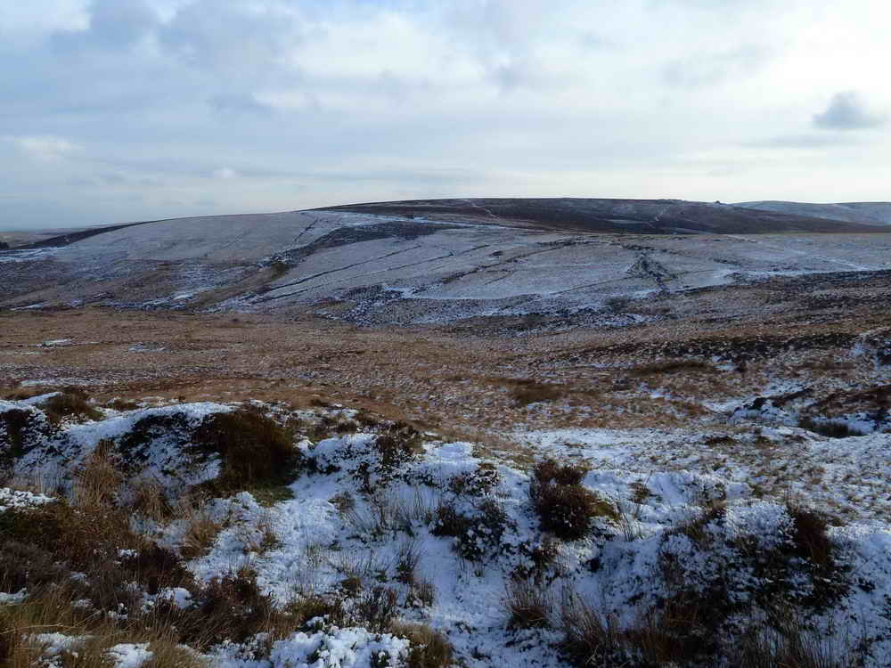 Looking towards the "Four Aces", the enclosures said to be in the form of the aces in a deck of cards, reputedly appearing where the cards were dropped by Jan Reynolds, as he was carried off by the Devil from Widecombe church. Photos of the enclosures are found at the bottom of the Jan Reynolds and the Devil web page. They are shown on the following map .....