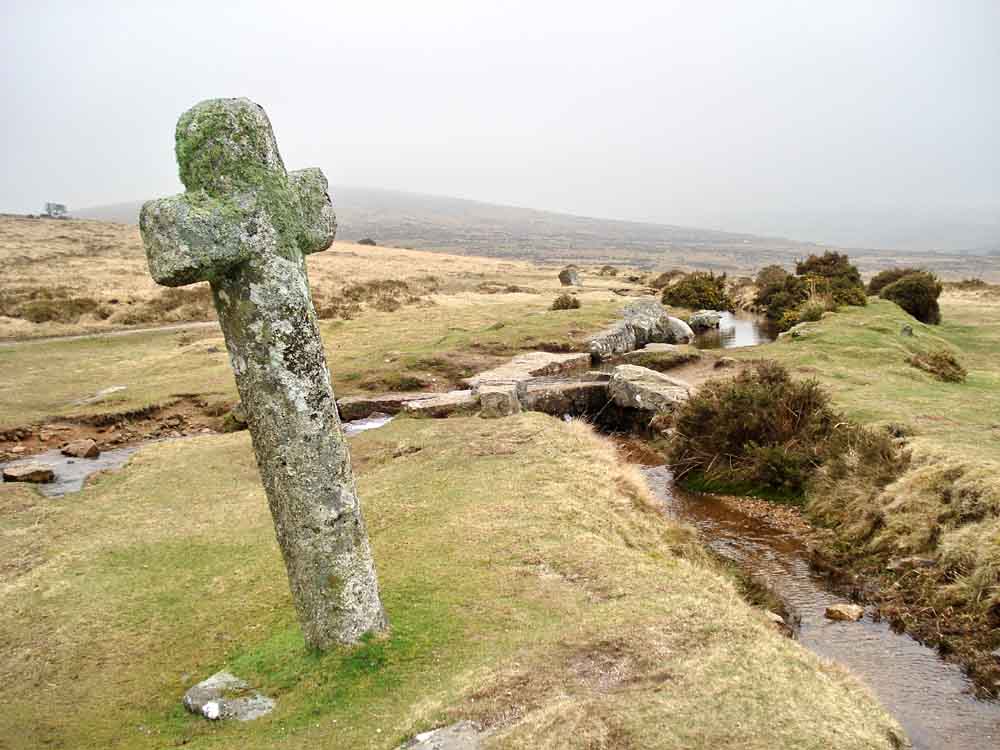 Windy Post, also known as Windy Post Cross, Windystone and Beckamoor Cross, at SX 535 743, with another bullseye stone in the near background. The cross stands on an old packhorse track between Ashburton, Moretonhampstead to Tavistock and is on the old Abbot's Way. It is believed that an older cross stood here once because the present one has a recent octagonal column, this is because "win" is a translation of the Celtic "ean", which means water.