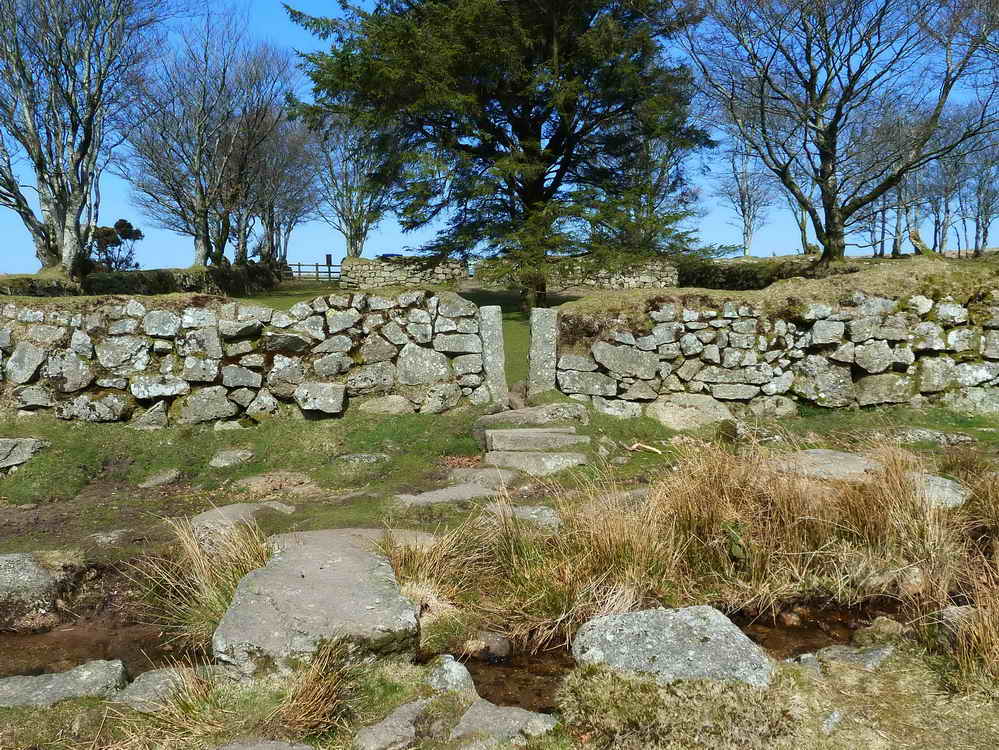 Clapper bridge over the leat with a narrow entrance into the old school house garden and playing field that was designed to keep sheep out .....